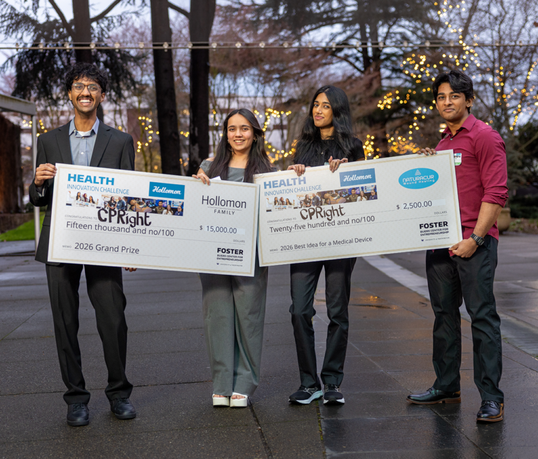 A CPright csapata balról: Shubham Bansal, Diya Sharma, Prisha Hemani és Atharva Dixit a Holloman Health Innovation Challenge győzelmével a Washington Egyetemen Seattle-ben ezen a héten. (UW Burke Center for Entrepreneurship Photo/Matt Hagen)
