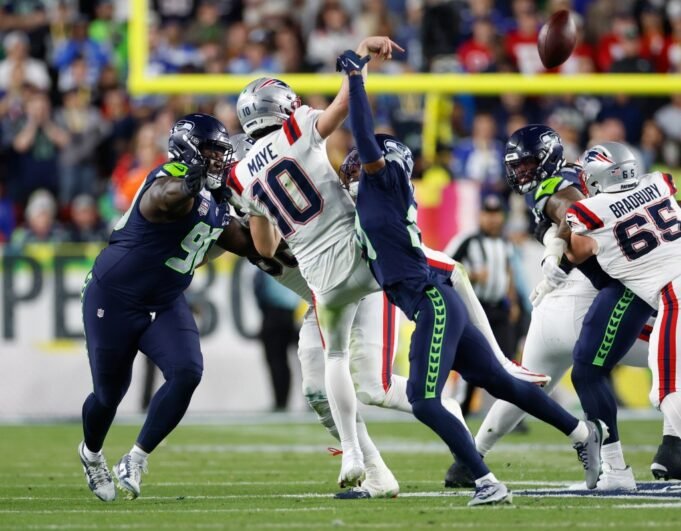 A Patriots második évének hátvédje, aki vállfájdalmaival küzdött a Super Bowl 60-on, büntető ütéseket szenvedett a Seattle-i védelemtől, miközben a nyitott fogadók felé passzolt.