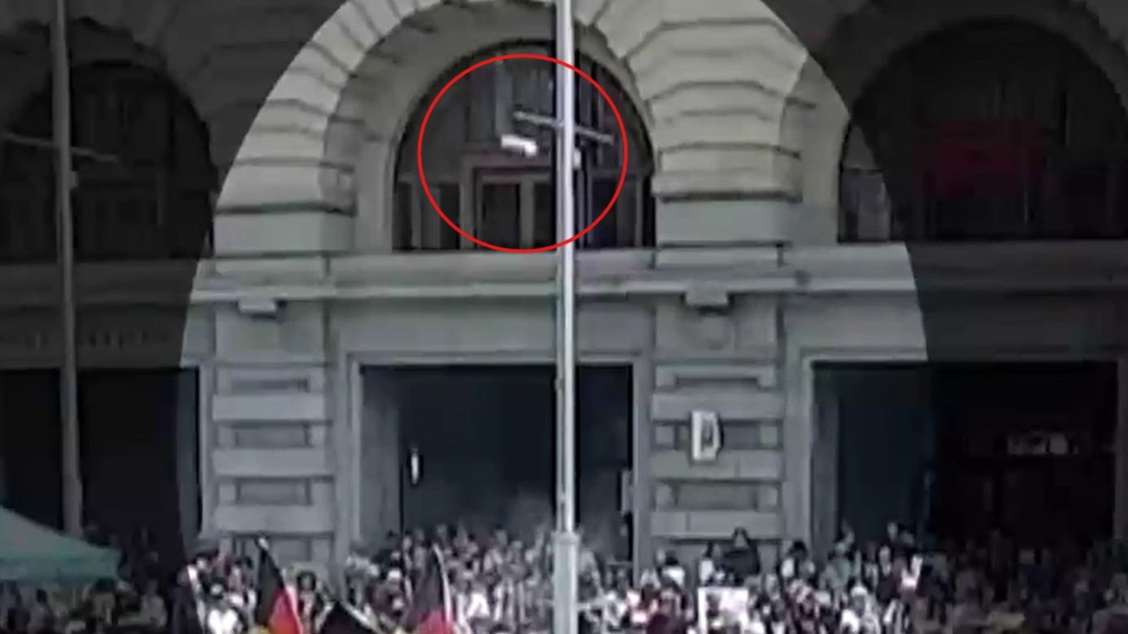 A biztonsági felvételeken látható, amint egy kávéscsésze alakú „bombát” indít a lenti tüntetők tömegébe.