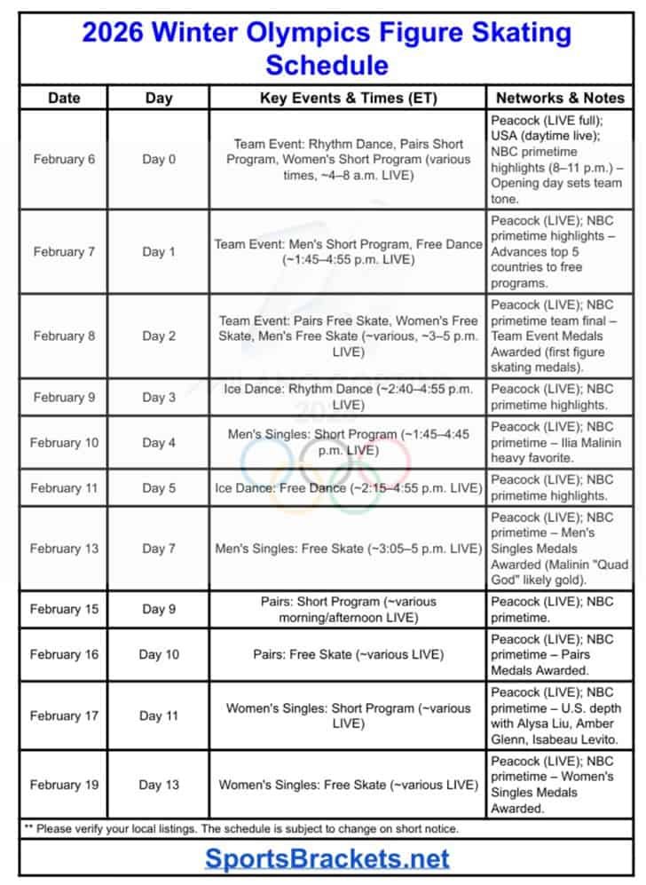 Íme a 2026-os téli olimpia műkorcsolya programja. A verseny 2026. február 6-tól február 19-ig tart. Az alábbiakban egy napi táblázat látható a legfontosabb eseményekkel, időpontokkal (ET) és érmekkel.