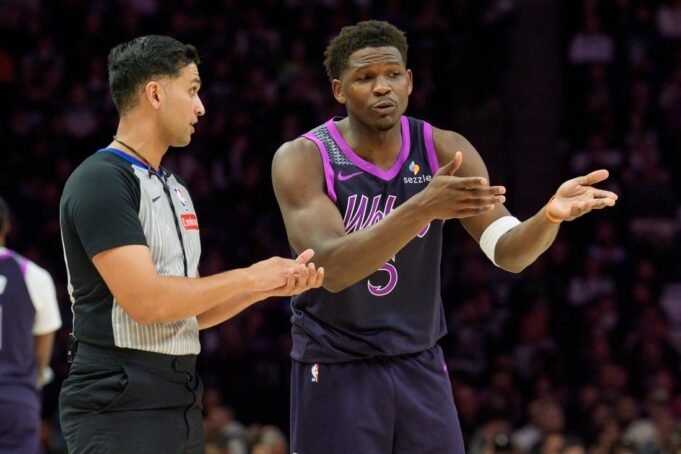 2026. február 20.; Minneapolis, Minnesota, USA; A Minnesota Timberwolves gárdája, Anthony Edwards (5) beszél Suyash Mehtával (82) a második negyedben a Dallas Mavericks ellen a Target Centerben. Kötelező forrás: Matt Blewett-Image Images