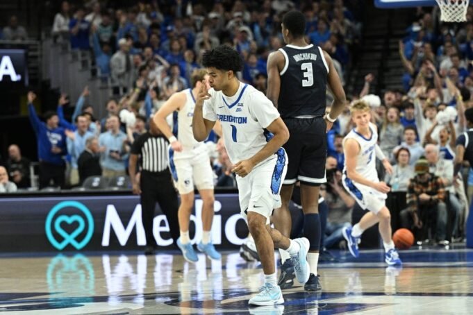 2026. január 13.; Omaha, Nebraska, USA; A Creighton Bluejays gárdája, Austin Swartz (1) reagál a Georgetown Hoyas elleni hárompontos kosara után az első félidőben a CHI Health Center Omaha-ban. Kötelező forrás: Steven Branscombe-Imagen Images