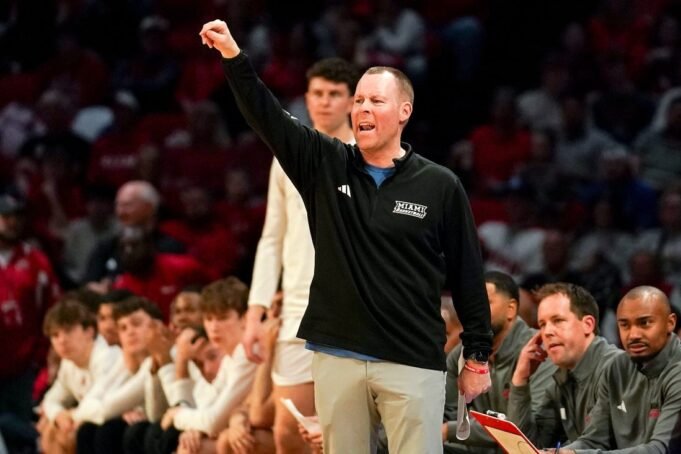 A Miami (OH) Redhawks vezetőedzője, Travis Steele kommunikál a játékosokkal a Miami Redhawks és a Toledo Rockets közötti NCAA férfi kosárlabda-mérkőzés első félidejében 2026. március 3-án, kedden a Millett Hallban, Oxfordban, OH-ban.