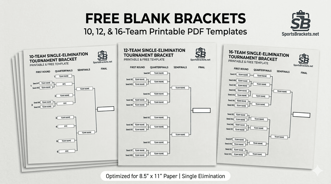 Akár helyi ifjúsági tornát, akár pácligát, akár egyedi irodai medencét szervez a March Madnesshez, a tiszta, professzionális keret elengedhetetlen. Az alábbiakban ingyenes, kiváló minőségű nyomtatható üres versenyzárókat kínálunk az Ön számára. A sablonok PDF és kép formátumban vannak 10 csapatos, 12 csapatos és 16 csapatos mezőkhöz. Ezeket a tartókonzolokat az egyszeres lejátszásra tervezték, és szabványos 8,5″ x 11″-es papírra formázták.