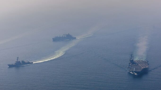 Az Egyesült Államok Védelmi Minisztériumától kapott tájékoztató fotón a Nimitz osztályú USS Abraham Lincoln (CVN 72) repülőgép-hordozó az Arleigh Burke osztályú irányított rakétarombolóval, a USS Frank E. Peterson Jr. (DDG 121) és a Lewis és Clark osztályú amerikai szárazteherhajóval (USNS6, Brassheb.) az USNS Carl-A Brasheb. 2026 7) Balra.
