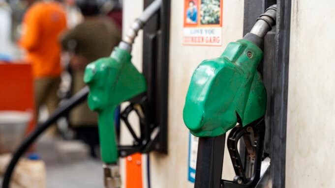 Üzemanyagfúvókák lógnak egy benzinszivattyún az indiai Guwahatiban, 2026. március 11-én. Donald Trump amerikai elnök iráni konfliktussal kapcsolatos megjegyzései után az olaj ára a közelmúltbeli csúcsról hordónkénti 90 dollár körülire zuhant. A piacok változékonyak maradnak, mivel a kereskedők folyamatosan figyelik a geopolitikai helyzet alakulását. (Fotó: David Talukdar/NurPhoto a Getty Images-en keresztül)