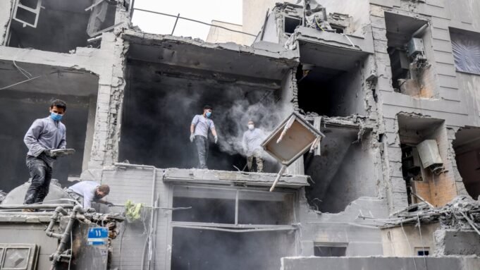 Az irániak a teheráni katonai támadás után a március 15-i teheráni katonai támadás után takarítják fel a törmeléket a megrongálódott otthonokról. Atta Kenare/AFP a Getty Images segítségével Hide felirat
