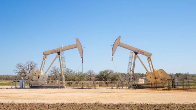 A szivattyúemelők a texasi Gillett területén dolgoznak 2026. március 11-én.