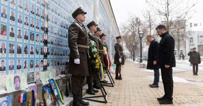 Volodimir Zelenszkij ukrán elnök, jobbra, és Donald Tusk lengyel miniszterelnök, jobbra, 2026. február 5-én meglátogatja a halottak emlékfalát Ukrajnában, a kijevi Szent Mihály-székesegyház előtt. Ukrán elnöki sajtószolgálat/Kiadó/Reuters